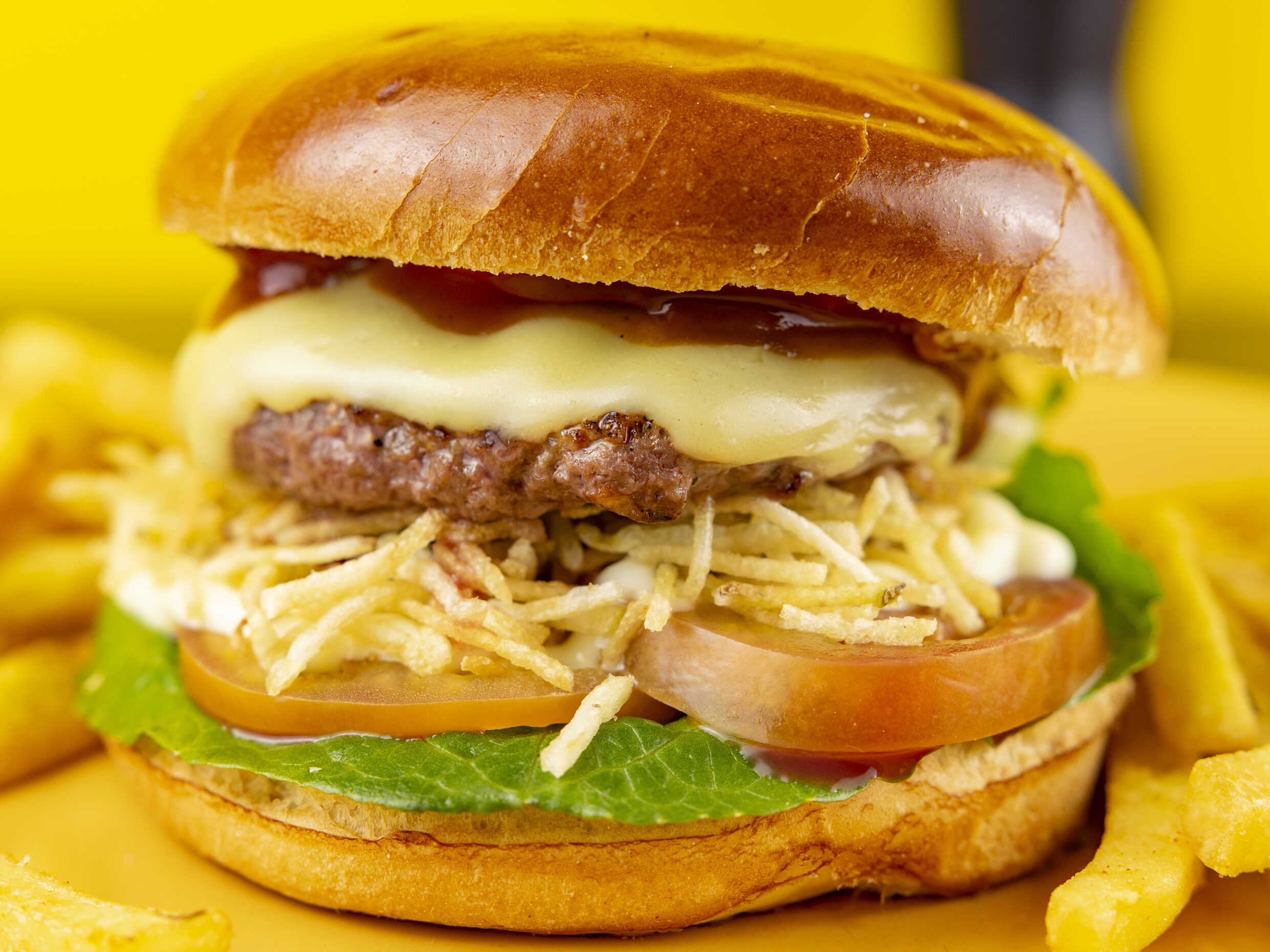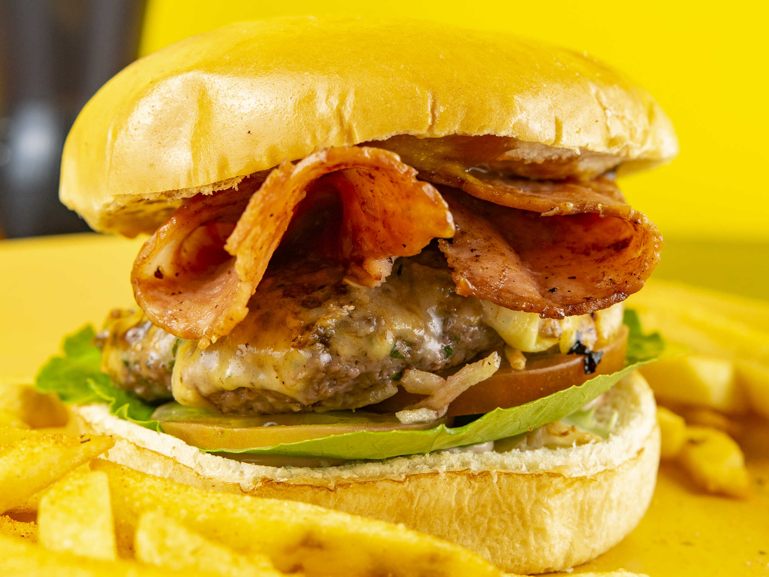 Carne 100% de res, queso, tocineta, cebolla crispy, lechuga, tomate y salsa burger..