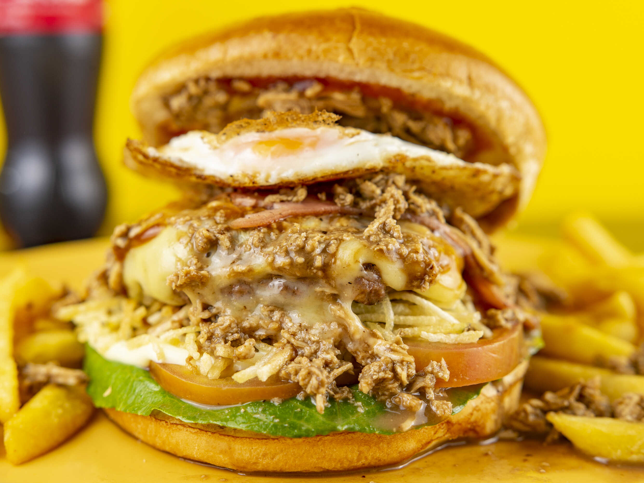 Carne de res, pollo desmechado, champiñones, tocineta, queso, huevo frito, papa fosforito, vegetales ( lechuga y tomate) y salsas de la casa.
