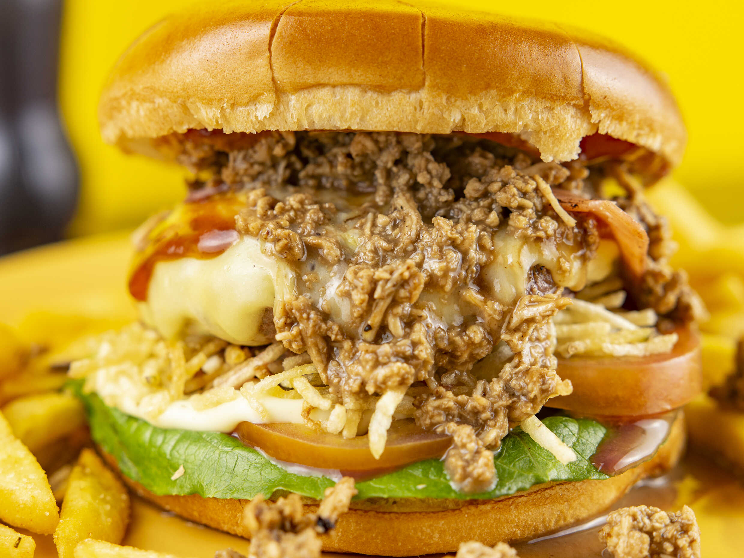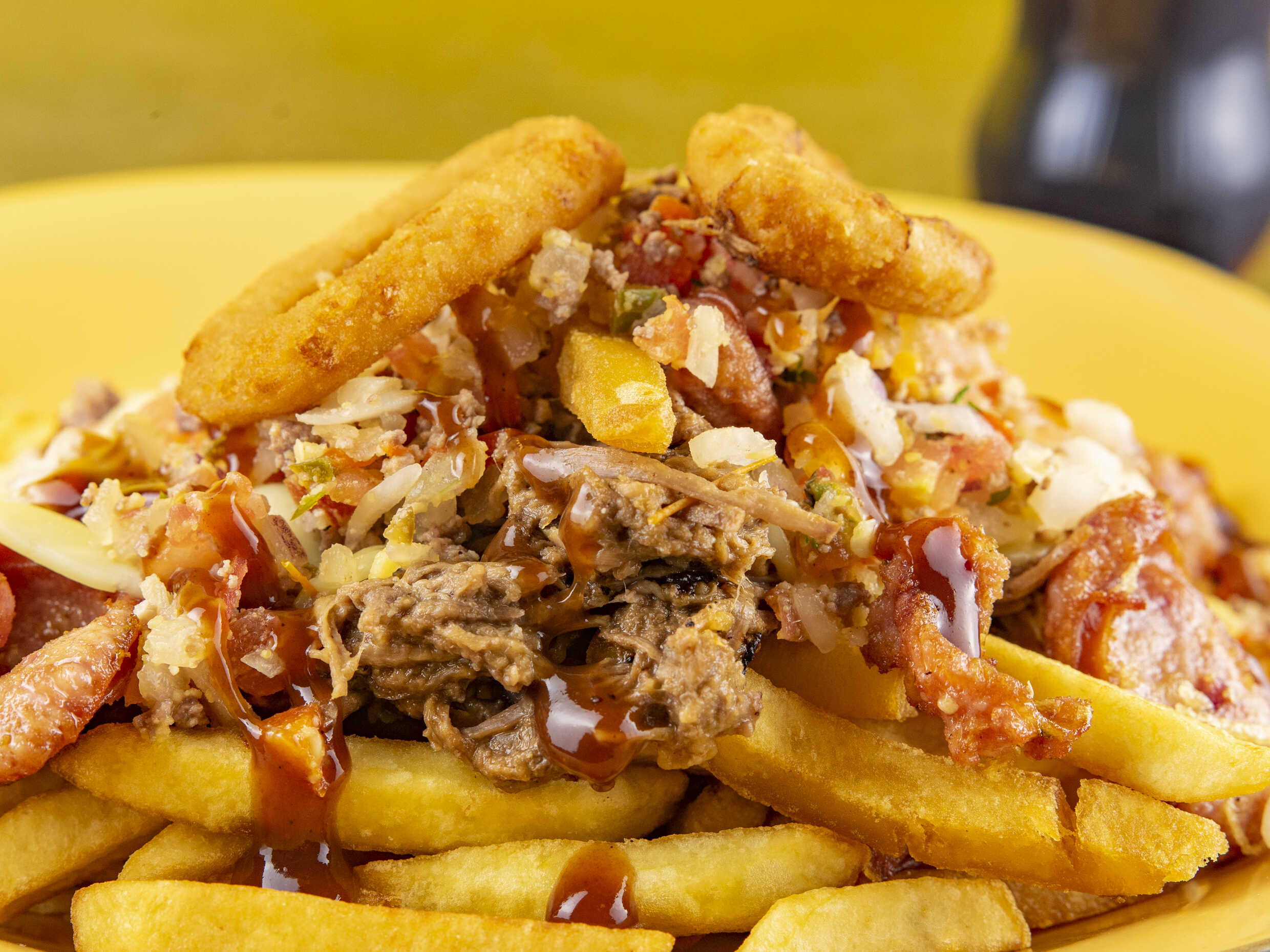 Carne desmechada, chorizo, salsa criolla, queso, pico de gallo, aros de cebolla y salsa BBQ.
