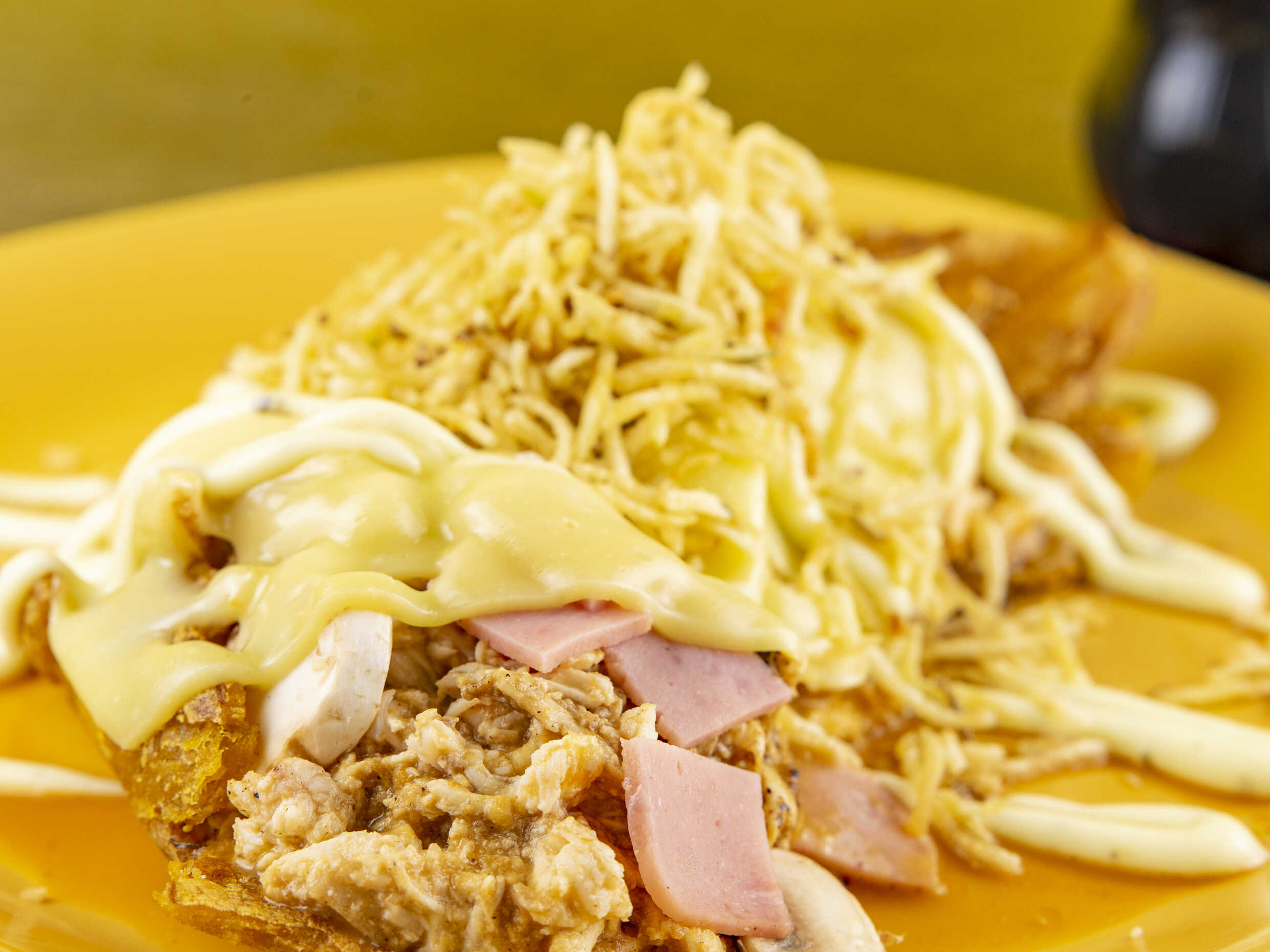 Pollo desmechado, salsa criolla, queso, jamón, papas fosforitos y salsa tártara.
