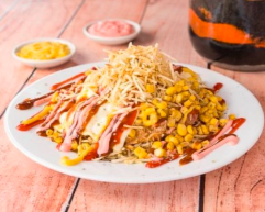 Maíz, carne desmechada, pollo desmechado, salsa criolla, jamón, queso y papas fosforitos.
