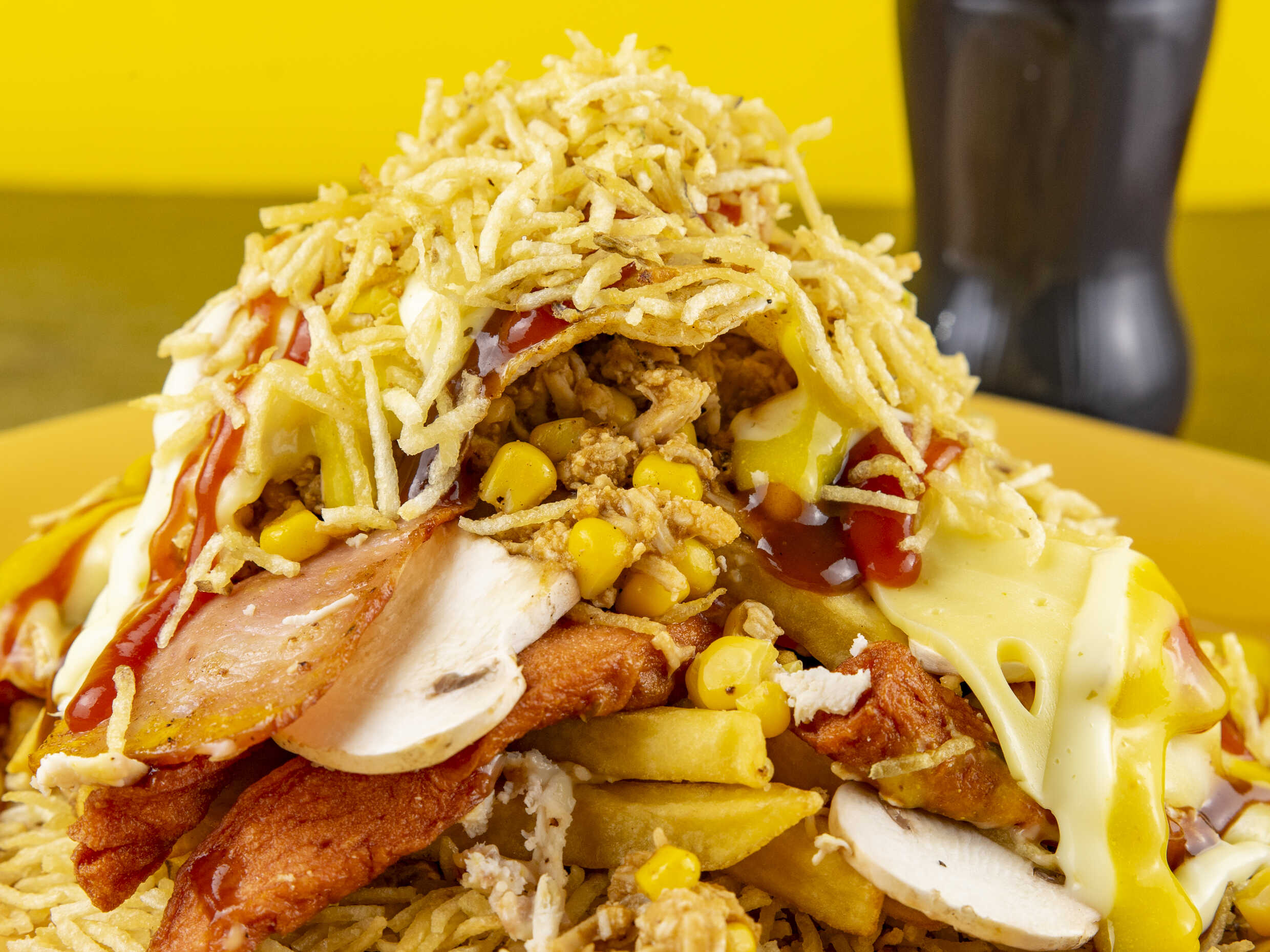 Salchicha americana, pollo desmechado, champiñones, maíz, tocineta, papa fosforito, jamón, queso fundido y salsas de la casa.