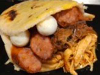 Deliciosa arepa de maiz peto, carne, chorizo, pollo, jamón, queso y huevo de codorniz acompañado de limonada