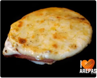 Arepa 100% maiz peto, doble porcion de queso y jamon.