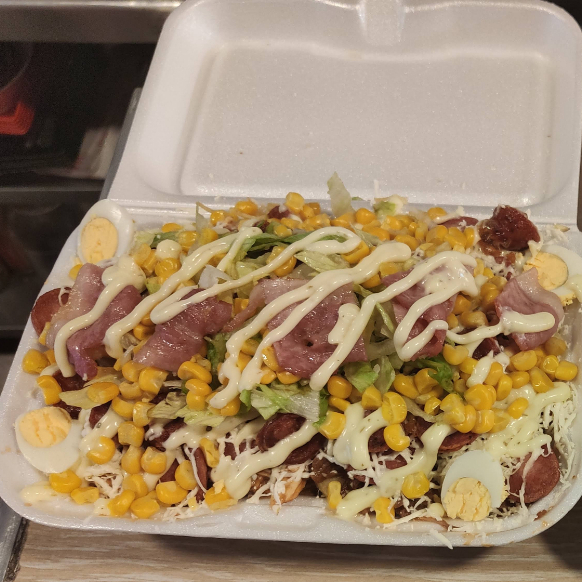 Pan bimbo, salchicha ahumada tipo americana, papa cabello de angel, queso rayado, maíz, tocineta, huevo de codorniz y salsas.