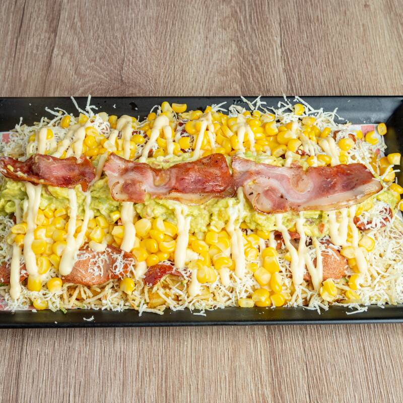 Patacón, queso rallado, carne y pollo a la parrilla, chorizo picado, maíz y guacamole.