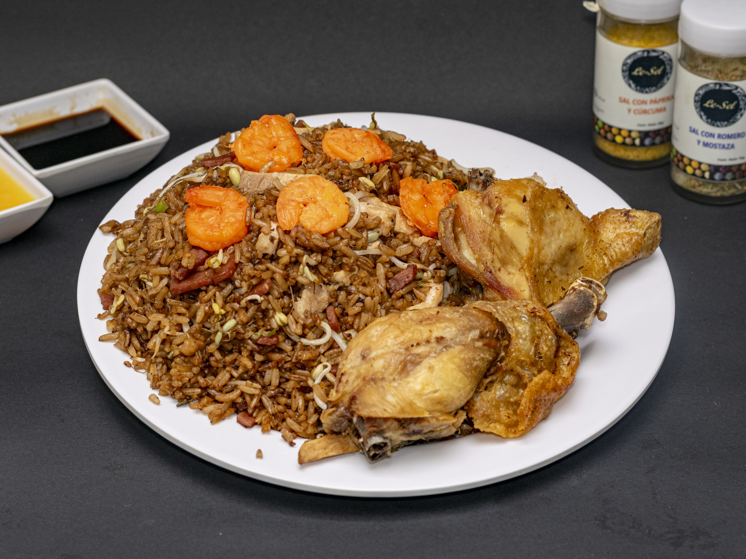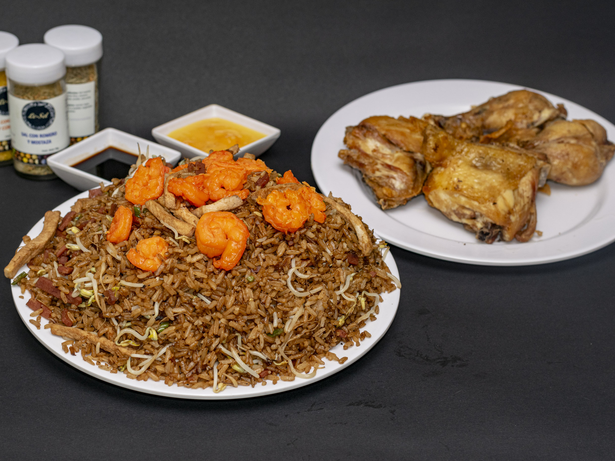 1/2 pollo frito, cerdo, jamón, camarón, raíz y china