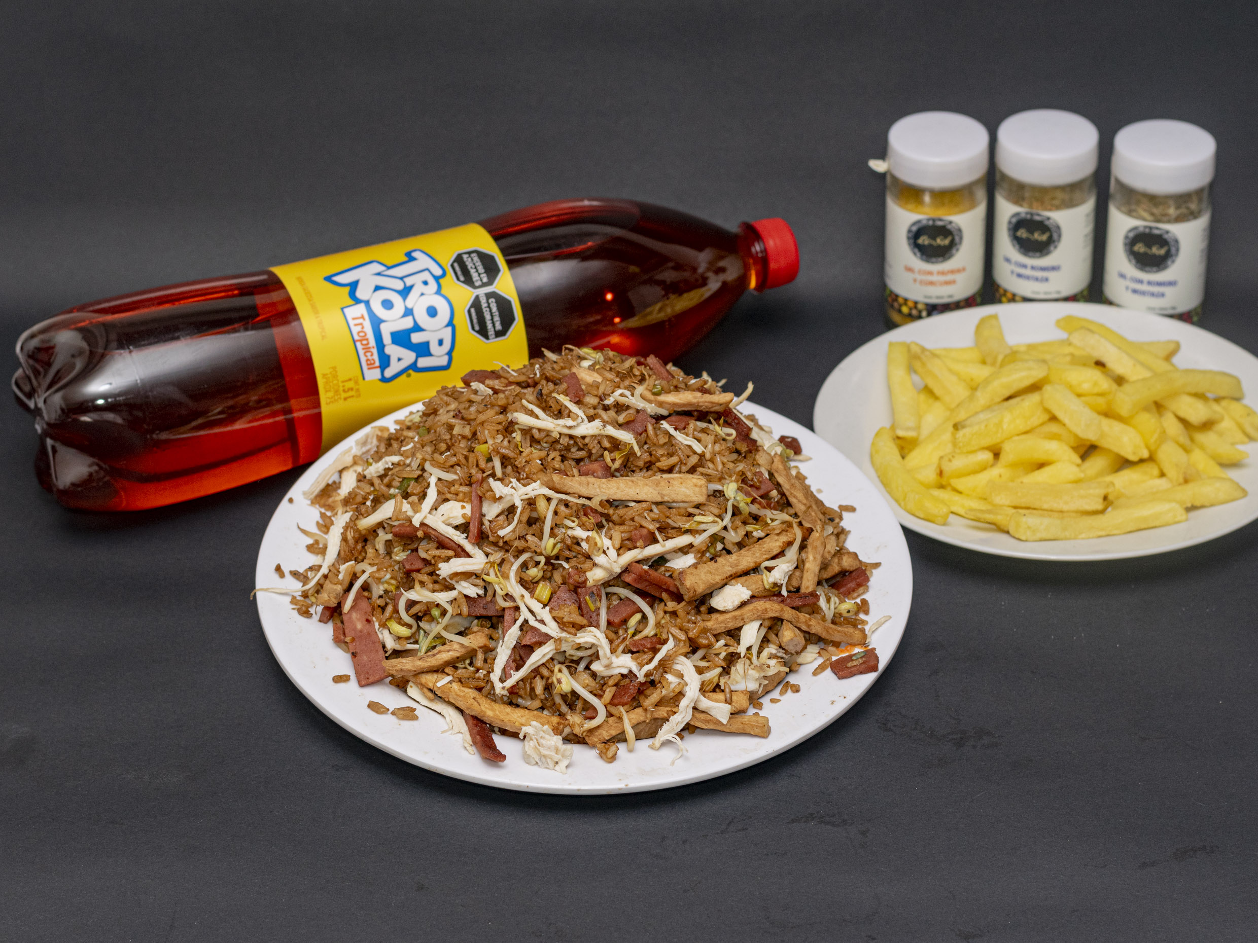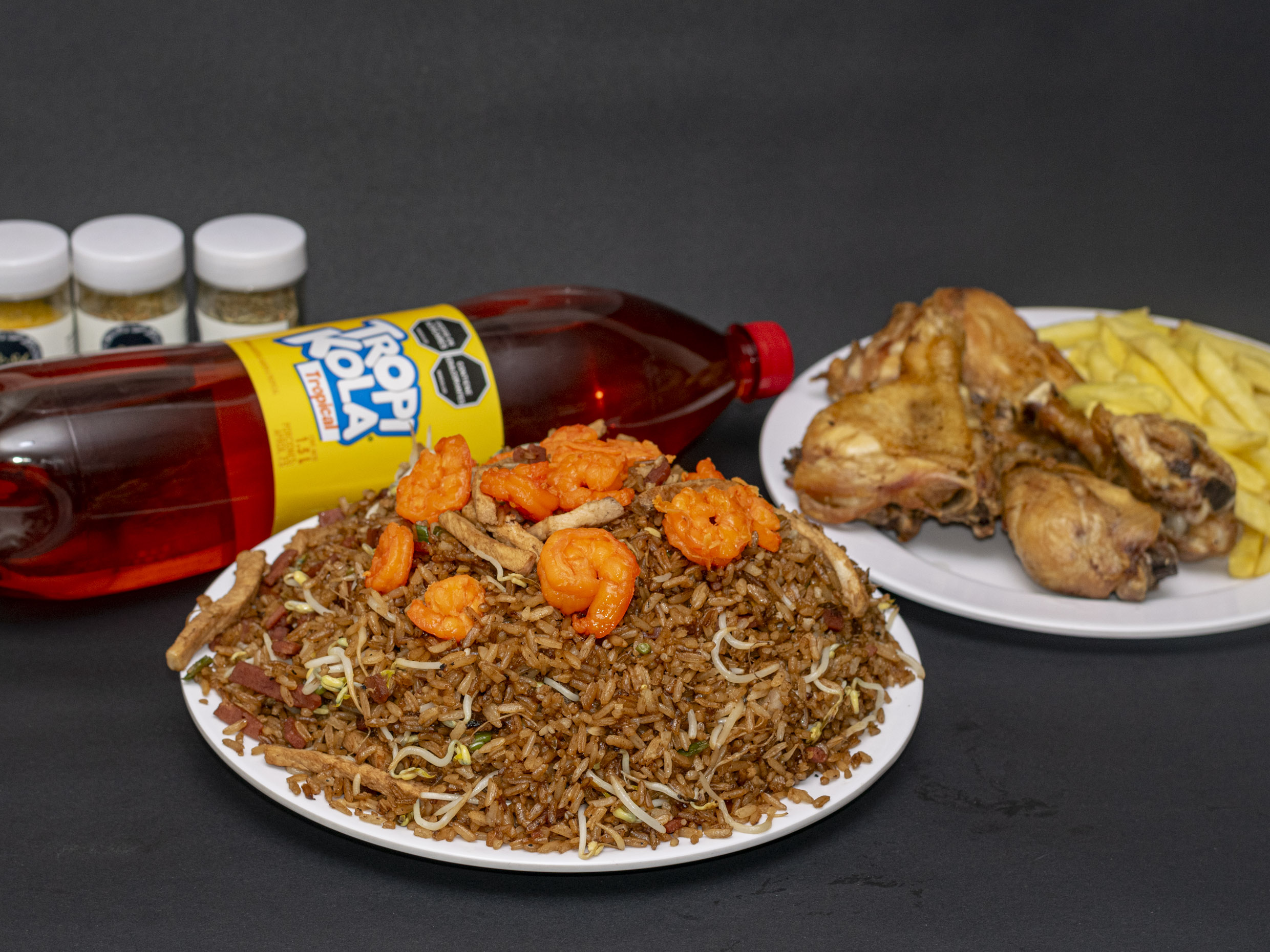 1/2 Pollo frito, Arroz Chino a la valenciana, porción de papa a la francesa y gaseosa 1.5L