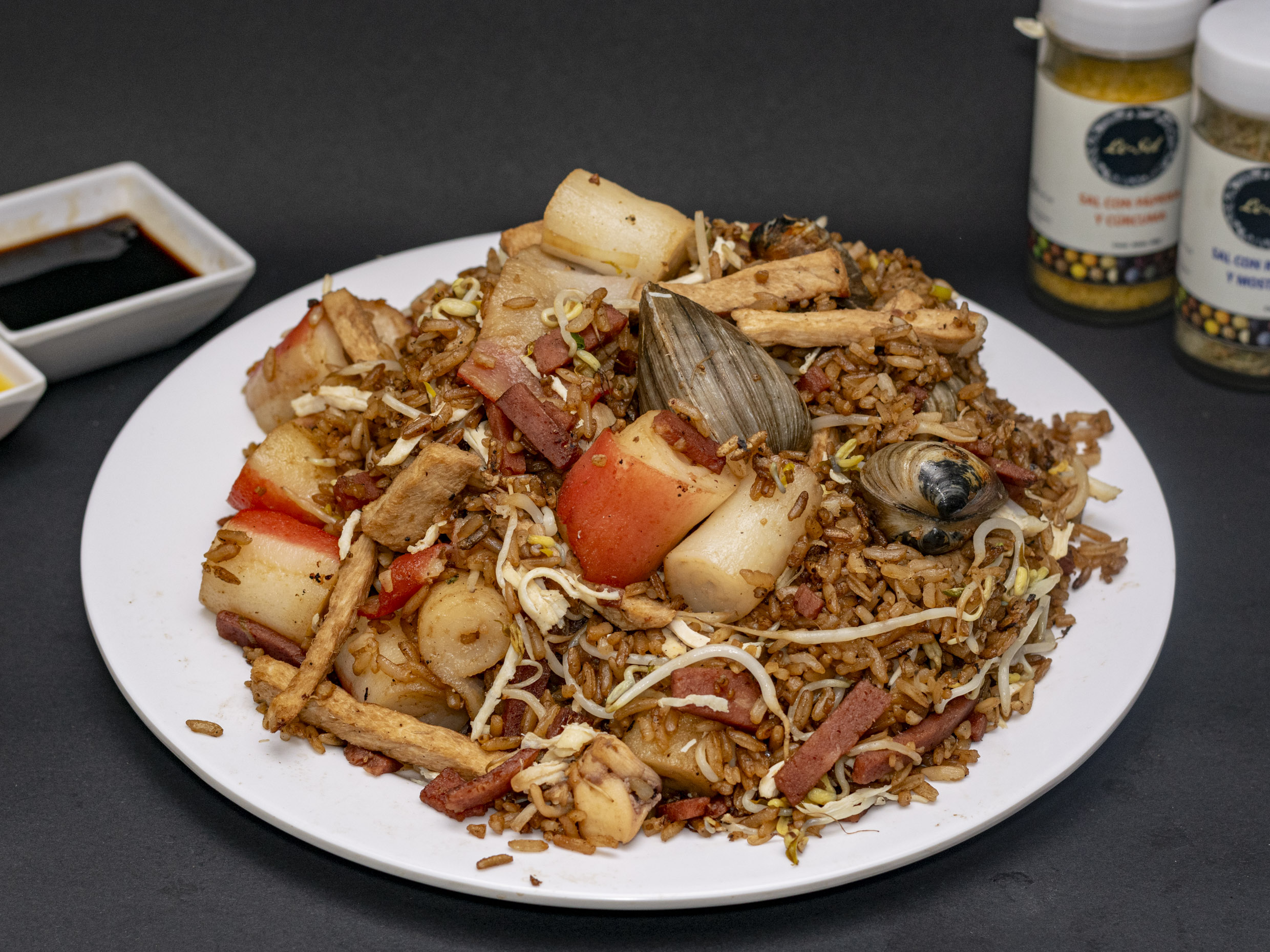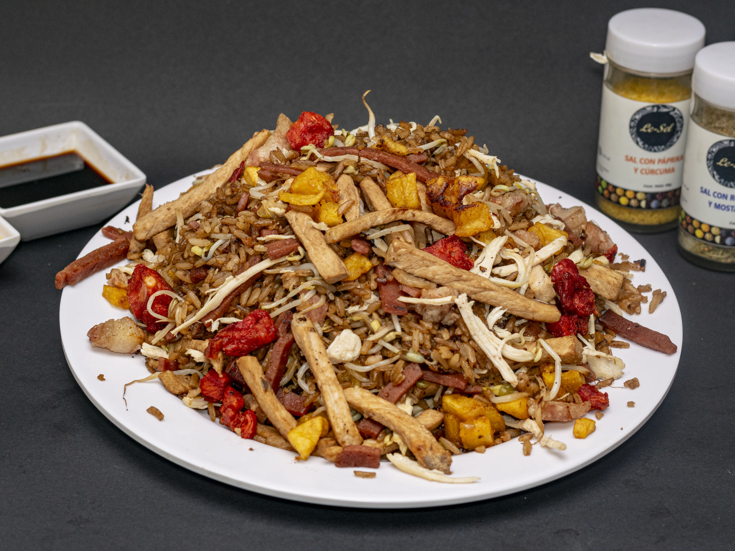 Proteína a elegir, cerdo, jamón, camarón, raíz y china