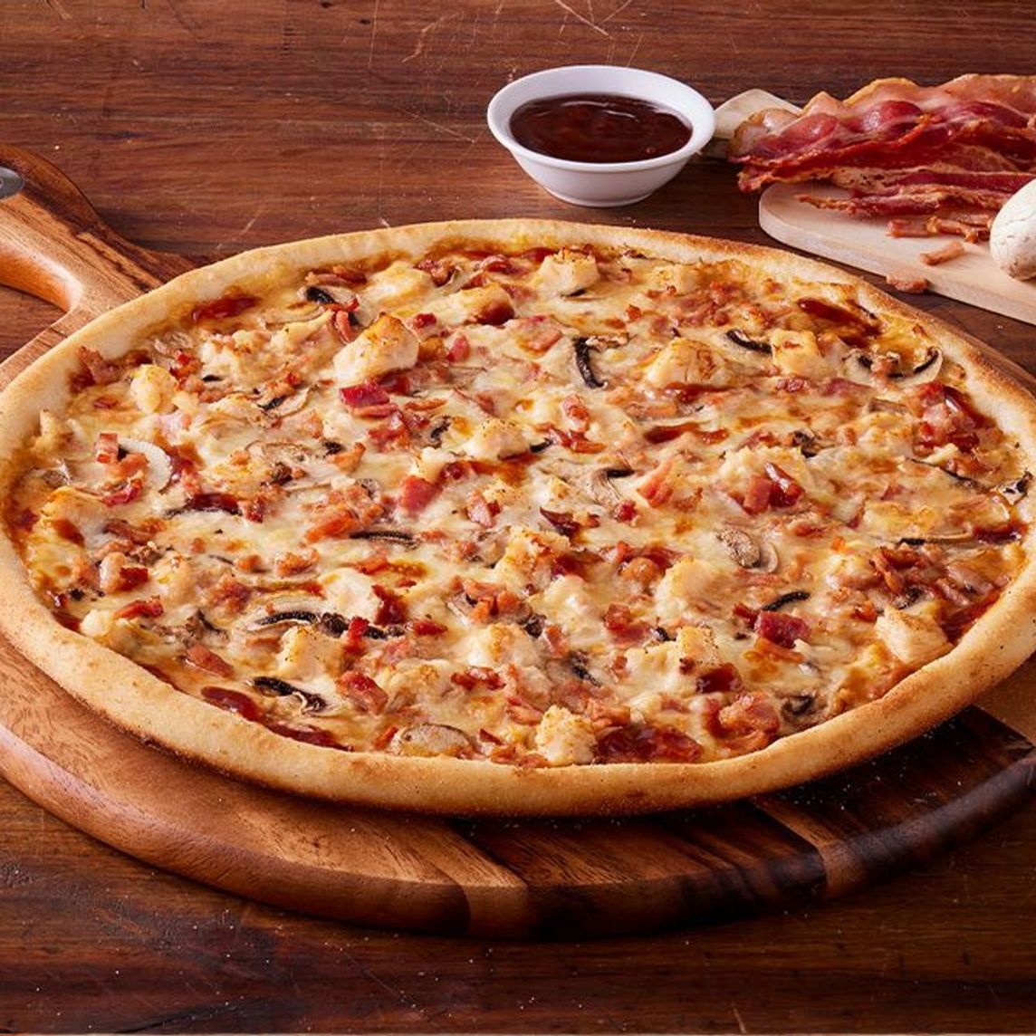 Queso mozzarella, tocineta, pollo y champiñones bañados en salsa blanca y salsa BBQ