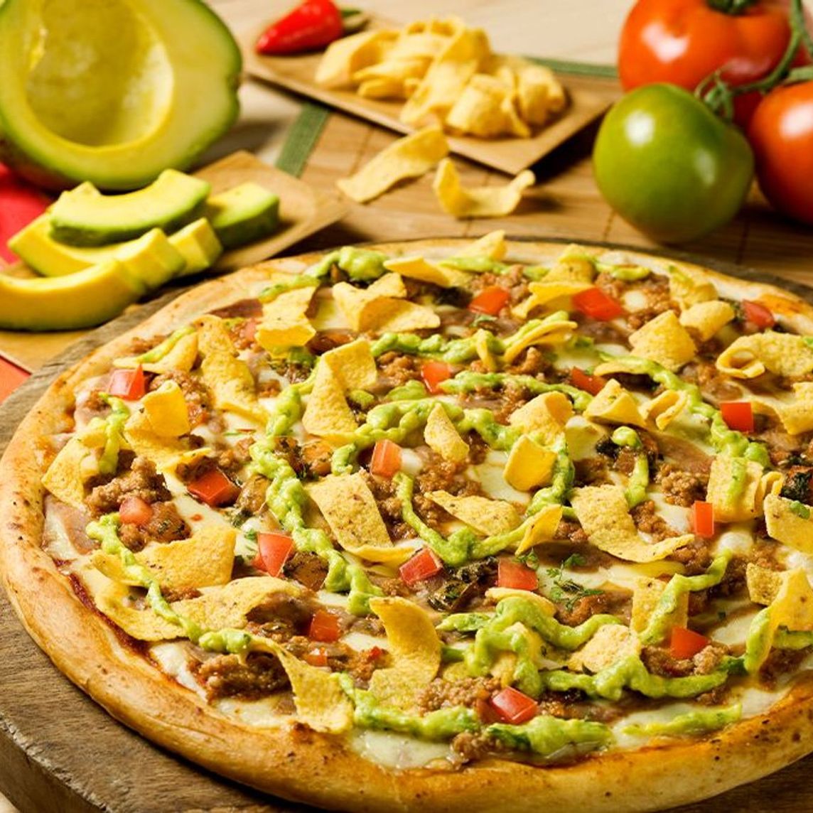 Pizza grande en masa delgada en recetas originales de la casa: Hawaiana, pepperoni, pollo champiñones, jamón champiñones, jamón queso, napolitana, primavera.