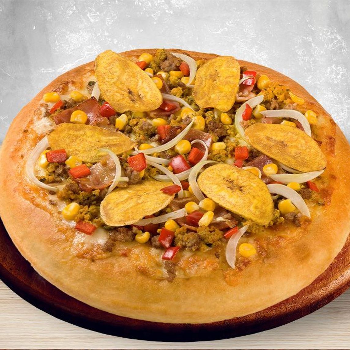 Queso mozzarella, hogao, Chorizo, carne molida, tocineta, maíz tierno, cebolla, pimentón y patacón