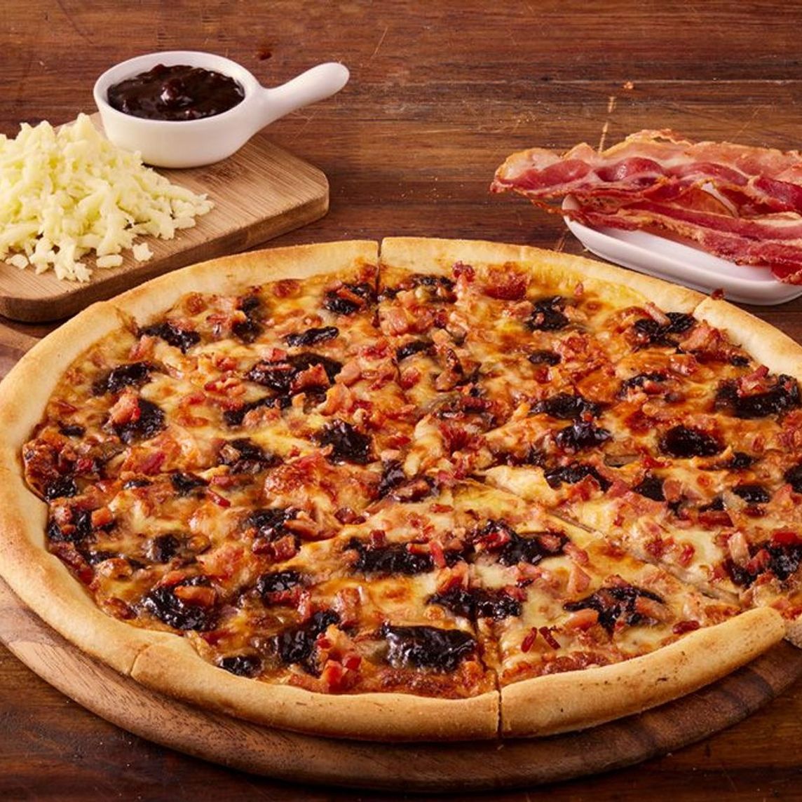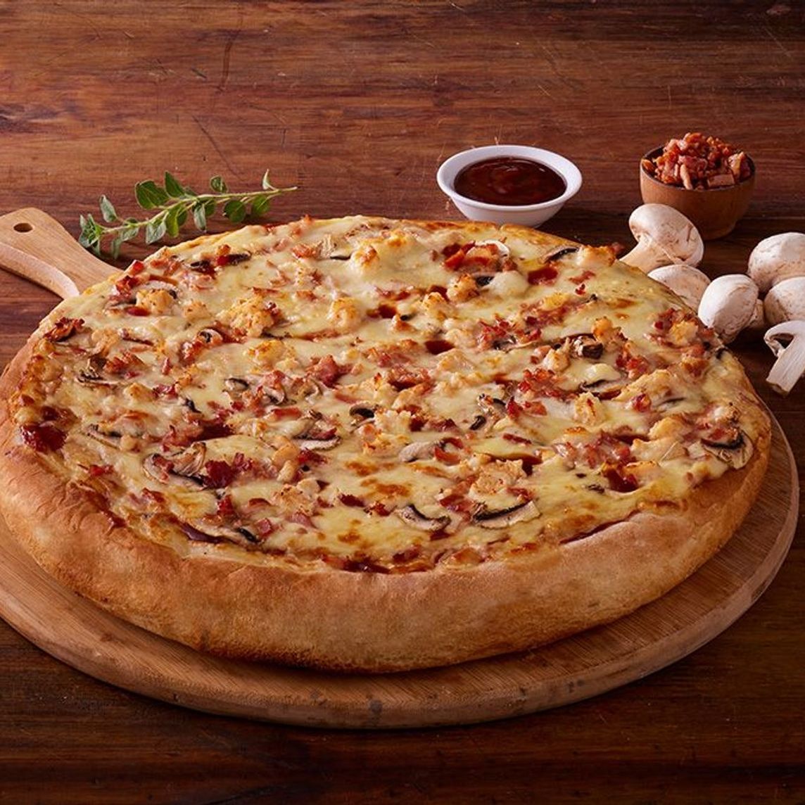 Queso mozzarella, tocineta, pollo y champiñones bañados en salsa blanca y salsa BBQ