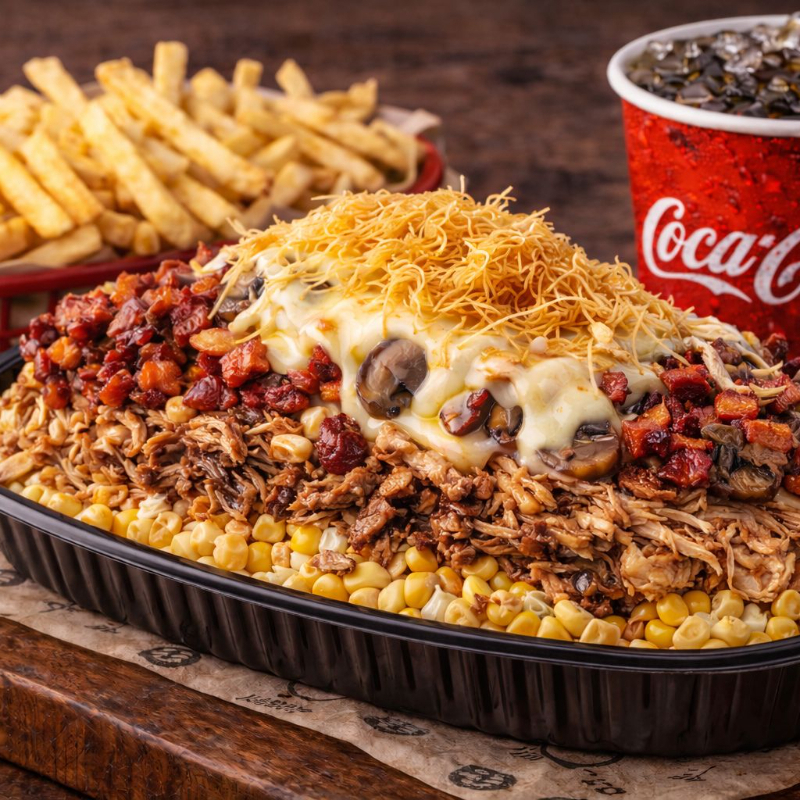 Arepa tipo paisa dorada a la plancha con pollo desmechado, tocineta ahumada, maíz desgranado, jamón de cerdo ahumado, toda esta mezcla con un leve toque de salsa BBQ y bañada en salsa blanca con queso doble crema fundido y salsa de la casa, acompañado de papas a la francesa y bebida personal
