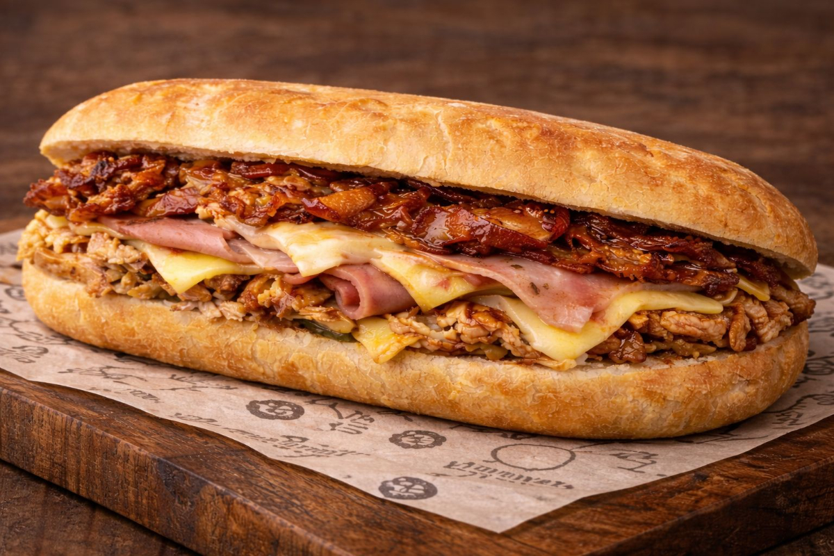 Pan árabe, relleno de pechuga de pollo desmechada y tocineta ahumada con un leve toque de salsa BBQ, jamón de cerdo ahumado y queso doble crema fundido con salsa de la casa