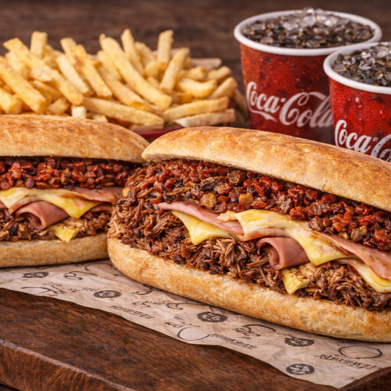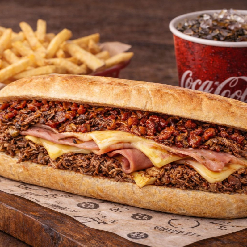Sánduche Distrito Federal*1 Pan árabe, relleno de carne molida con frijol bañados en aliño mexicano picante al gusto, champiñones laminados en salsa blanca, jamón de cerdo ahumado, guacamole, queso doble crema fundido, dipas picantes y salsa de la casa + Papa francesa*1 + Bebida*1