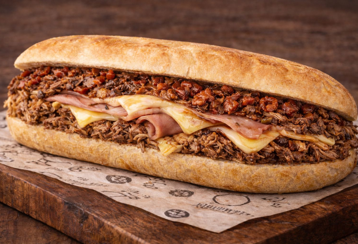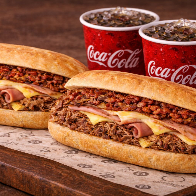 Sánduche mixto individual en pan árabe, relleno de sobrebarriga desmechada, pechuga de pollo desmechada, chorizo santarrosano laminado en salsa BBQ, jamón de cerdo ahumado y queso doble crema fundido con salsa de la casa.