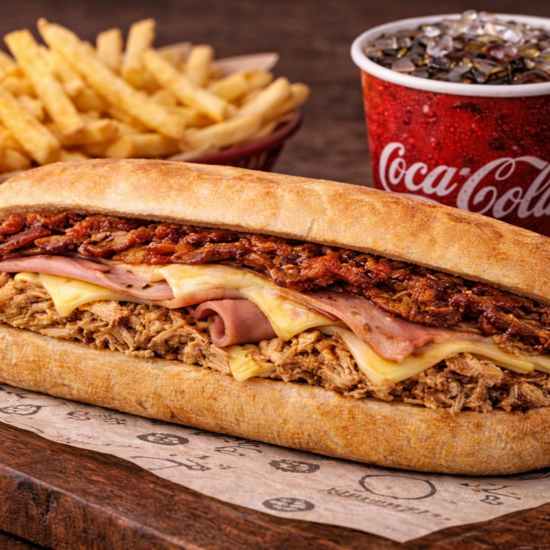 Pan árabe, relleno de 2 salchichas americanas, pollo desmechado, tocineta ahumada, jamón de cerdo ahumado y queso doble crema fundido, papita cabello de ángel con salsa de la casa, acompañado de papas a la francesa y bebida personal presentación flexi.