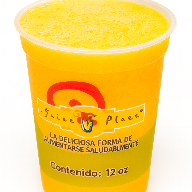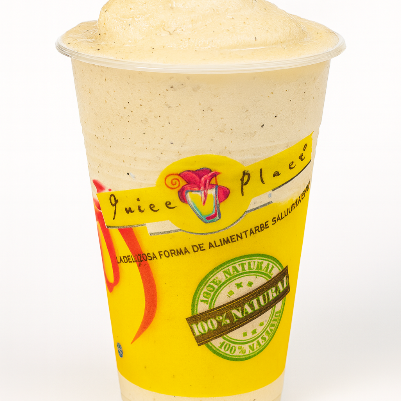 Granizado de maracuyá natural con fruta, naranja y leche condensada.