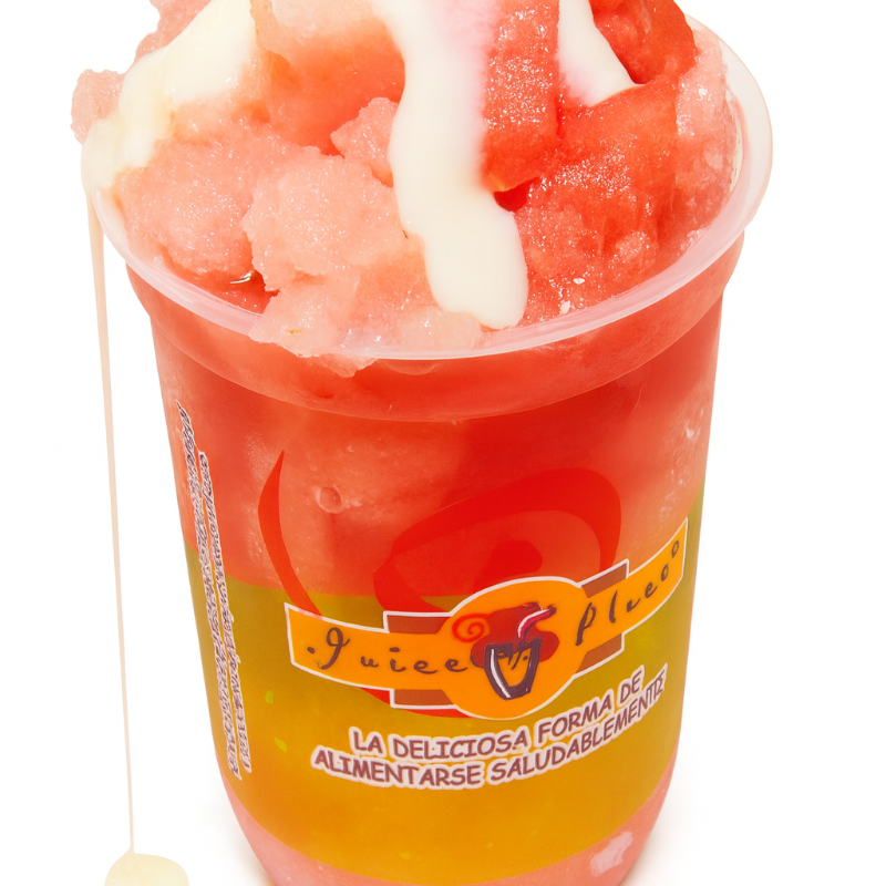 Granizado de patilla natural con trozos de fruta, limón y leche condensada.