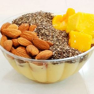 Cama de crema de mango cubierta con almendras, semillas de chía y trozos de mango.