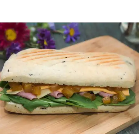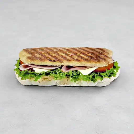 Jamón de cerdo, queso mozzarella, miel mostaza, lechuga y tomate.