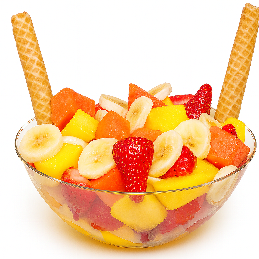¡El antojo más fresco y completo! Disfruta de nuestra Ensalada de Frutas Clásica (Básica) con variedad de frutas frescas, crema de leche, salsa de mora, barquillos y una generosa corona de crema chantilly. Acompáñala con un Jugo Natural de 16 oz preparado al momento con tu fruta favorita.