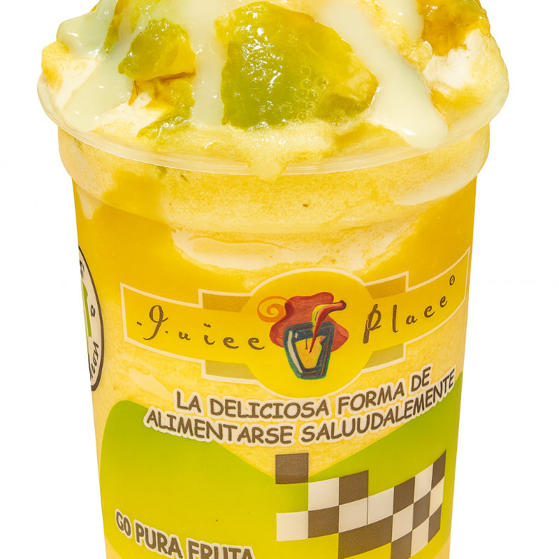 Limonada de mango granizada con trozos de fruta y leche condensada.