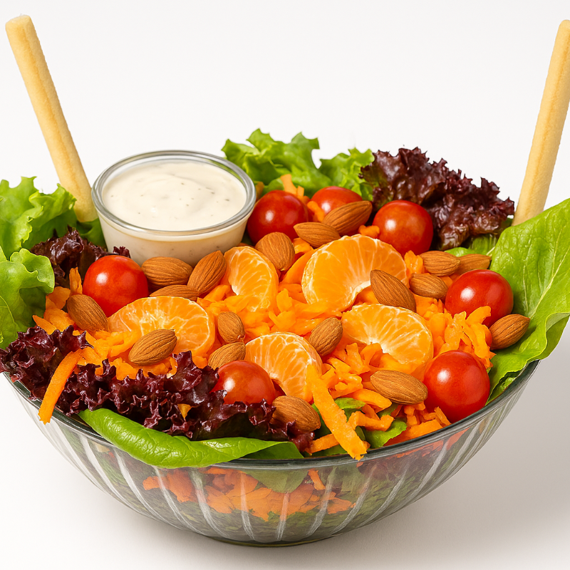 Cascos de mandarinas, pollo desmenuzado, almendras, zanahoria y aderezo ranch.
