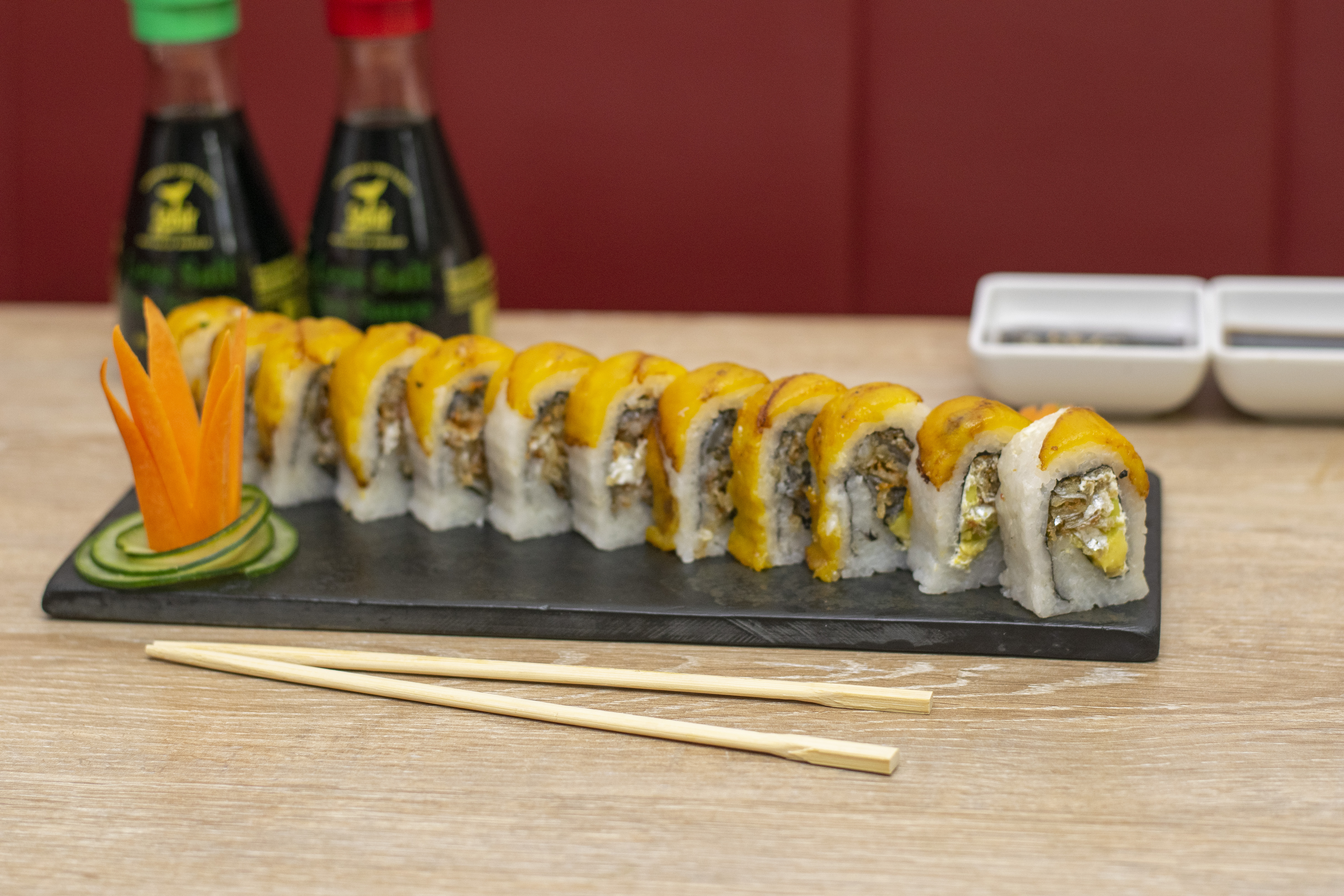 Camarón crocante, vegetales crocantes, queso crema, topping de salsa de mango, salsa teriyaki.