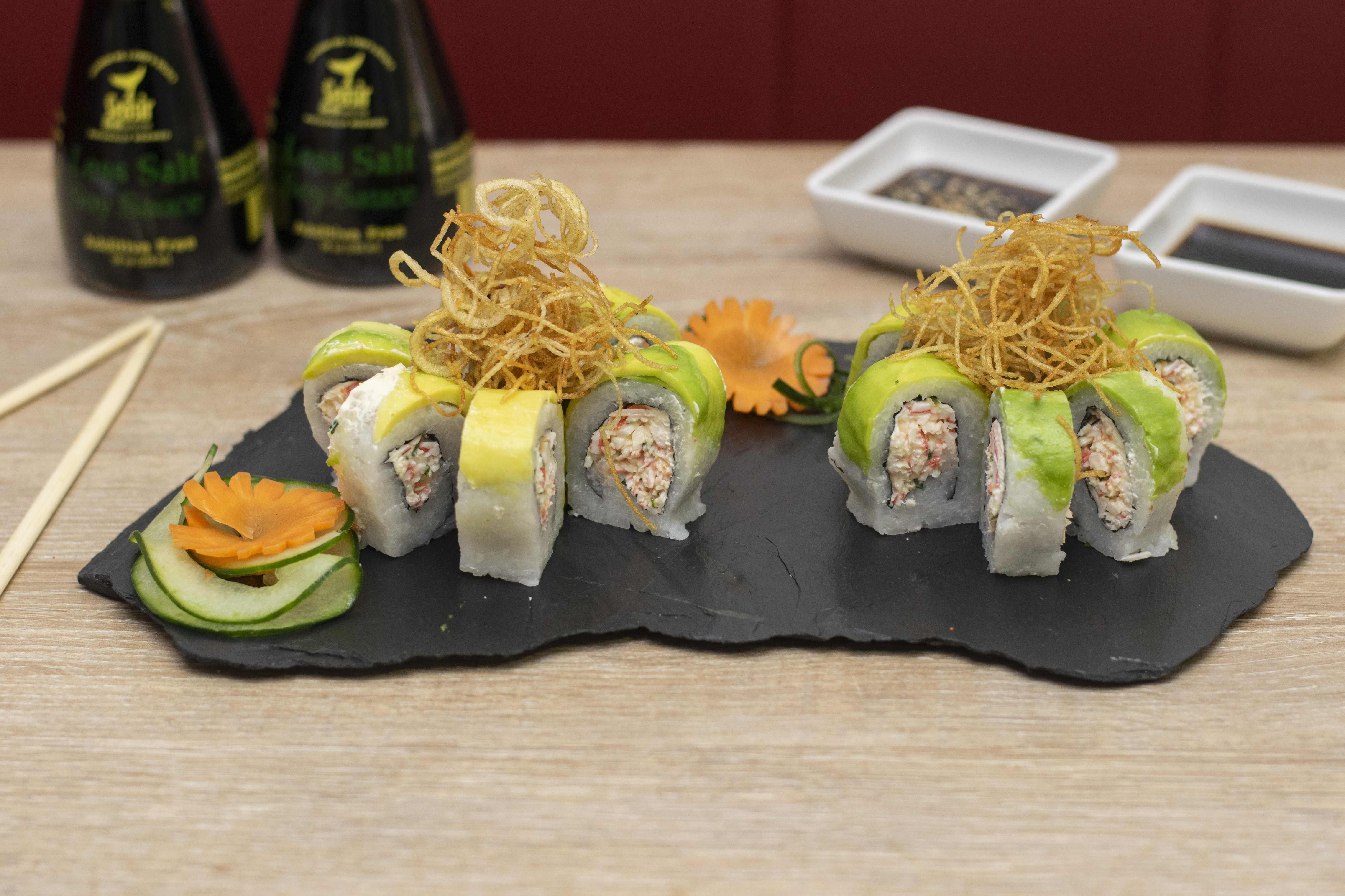 Arroz de sushi con lechuga, pepino, aguacate, zucchini, pimentón, cebolla blanca y zanahoria (tempuras).
