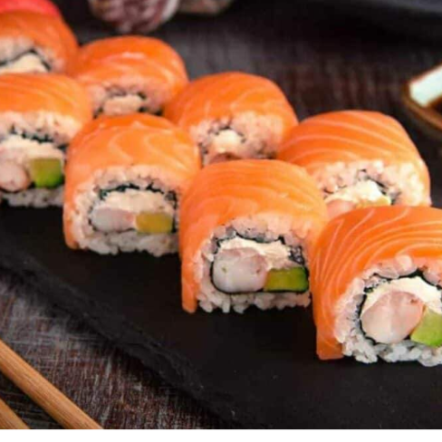 Roll de sushi relleno de salmon,aguacate , queso crema, envuelto en salmón. Incluye 1 soya 1 juego de palitos 12 bocados.