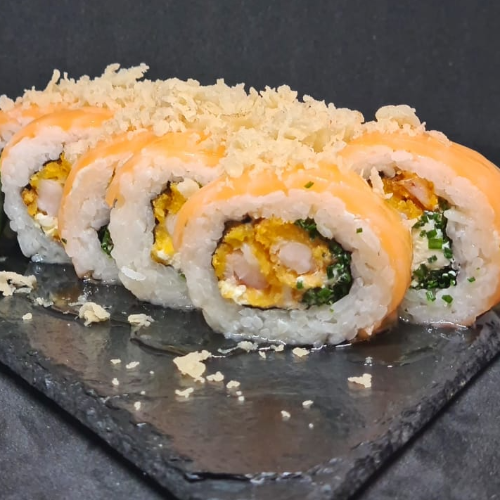 Roll de camarón, queso crema y CEBOLLIN, envuelto en salmón. TOPPING DE CHISTAS DE LLUVIA DE TEMPURA 12 bocados. INCLUYE 1 SOYA 1 JUEGO DE PALITOS