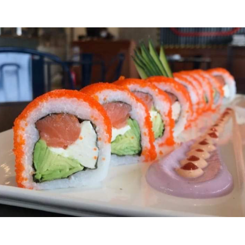 Cangrejo tempurisado, queso crema, aguacate, envuelto en salmon 12 bocados. incluye 1 soya 1 juego de palitos