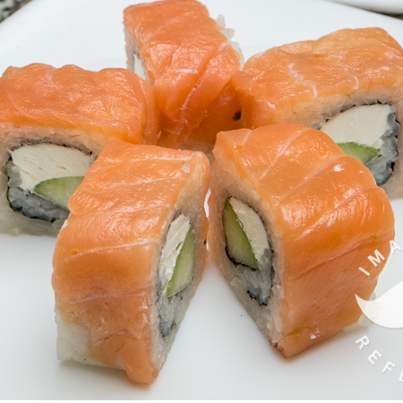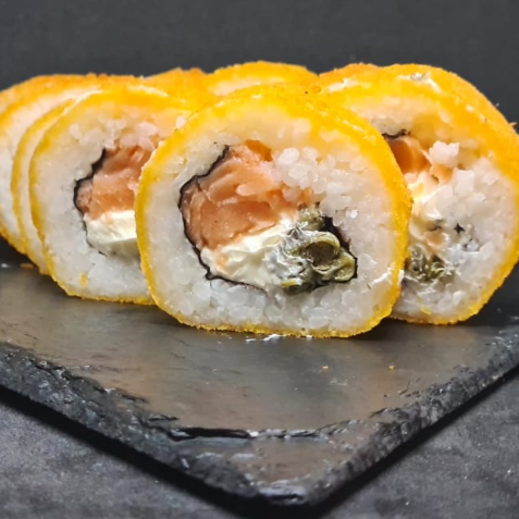 Roll de sushi con salmón, queso crema y aguacate, cubierto de apanado. Incluye 1 SOYA 1 JUEGO DE PALITOS 12 bocados.