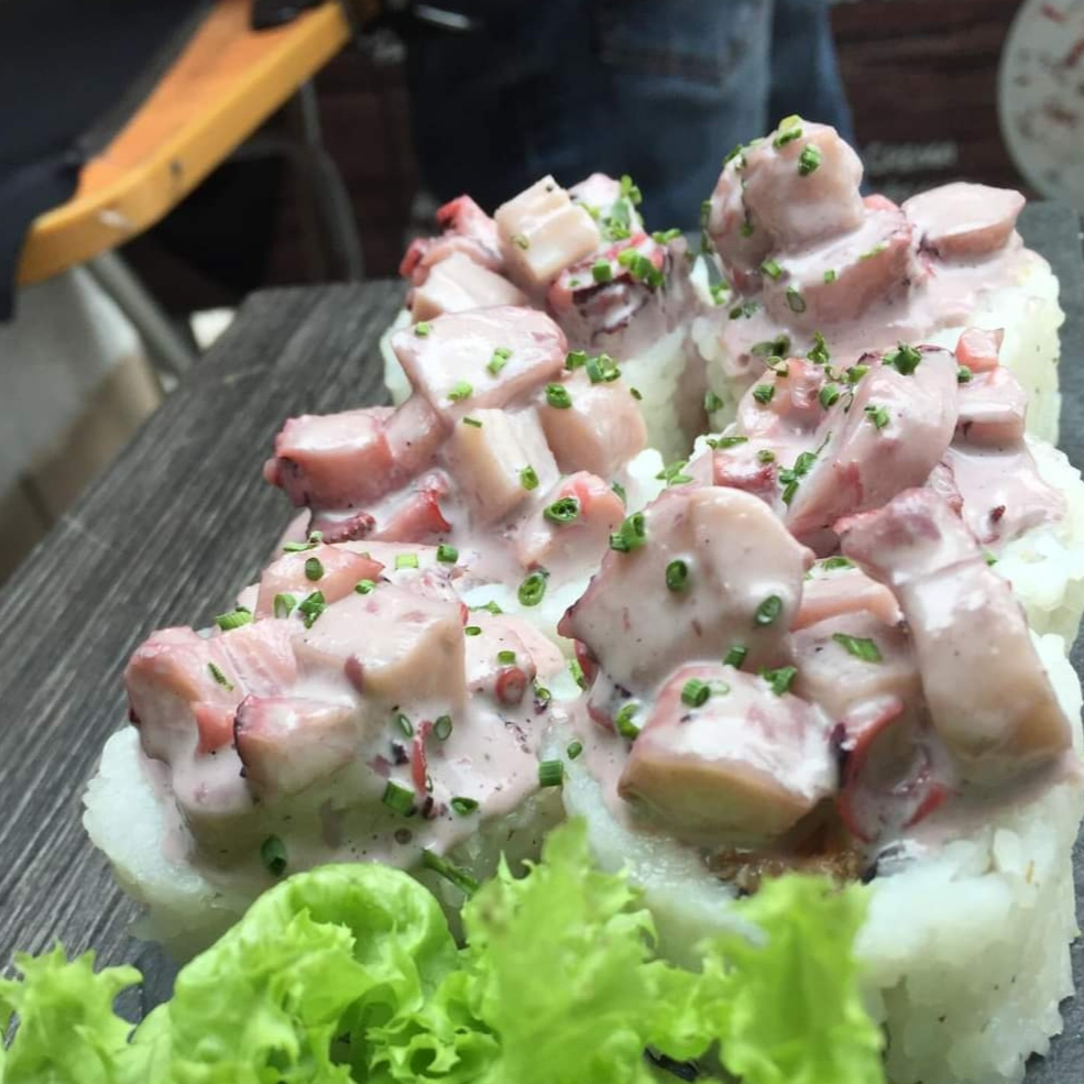 Calamar, cebollin, platano maduro: cubierto de ajonjoli, topping de pulpo y salsa acevichada 12 bocados .