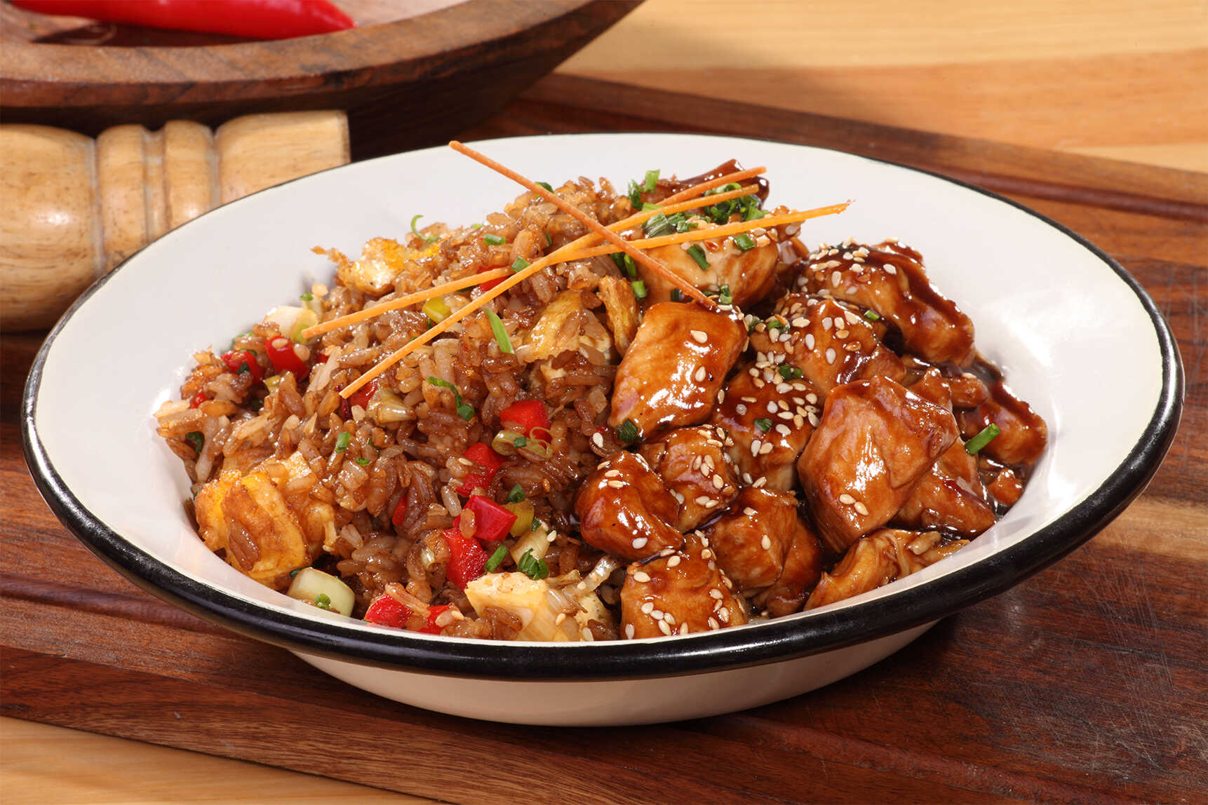 A nuestro chaufa clásico lo engallamos con un pollo bañado en salsa de ostión. Un clásico de la cocina chino - peruana.