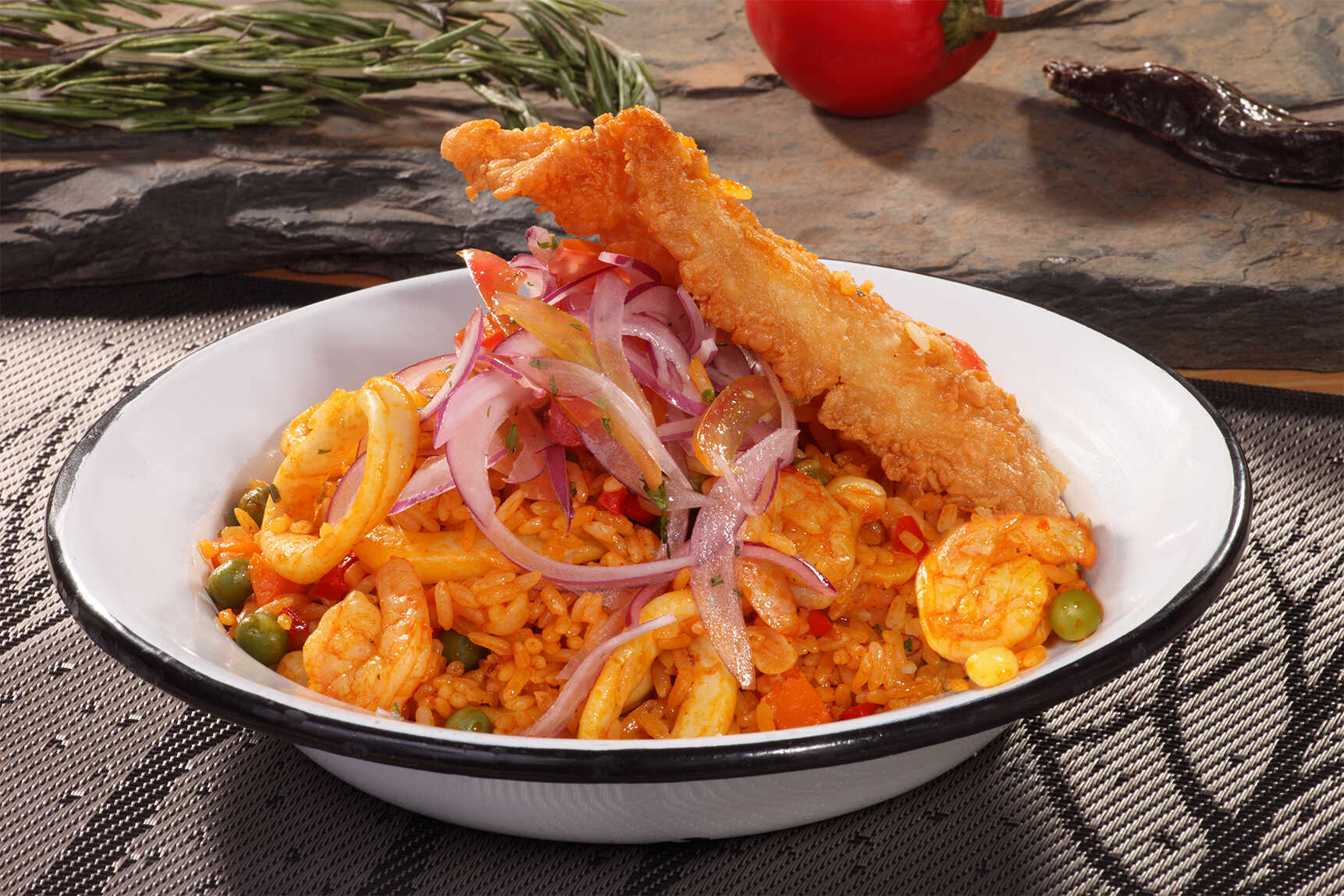 Delicioso arroz caldoso en salsa de mariscos de la casa. Servido con mix de camarones, calamar y pescado apanado, acompañado con ensaladita de cebolla y tomate.