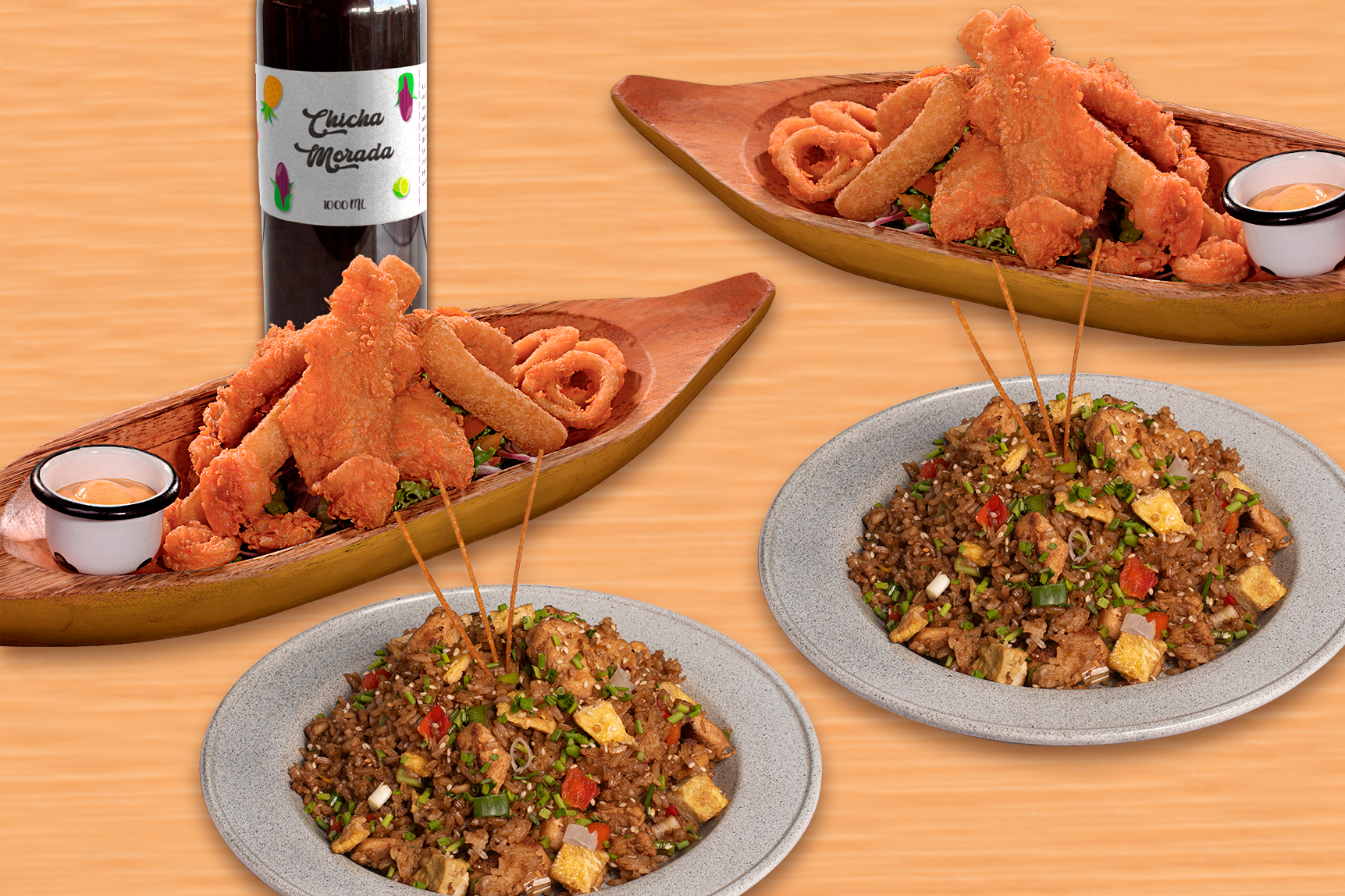 2 Chaufas, 2 jaleas mixtas, 1 litro de Chicha.