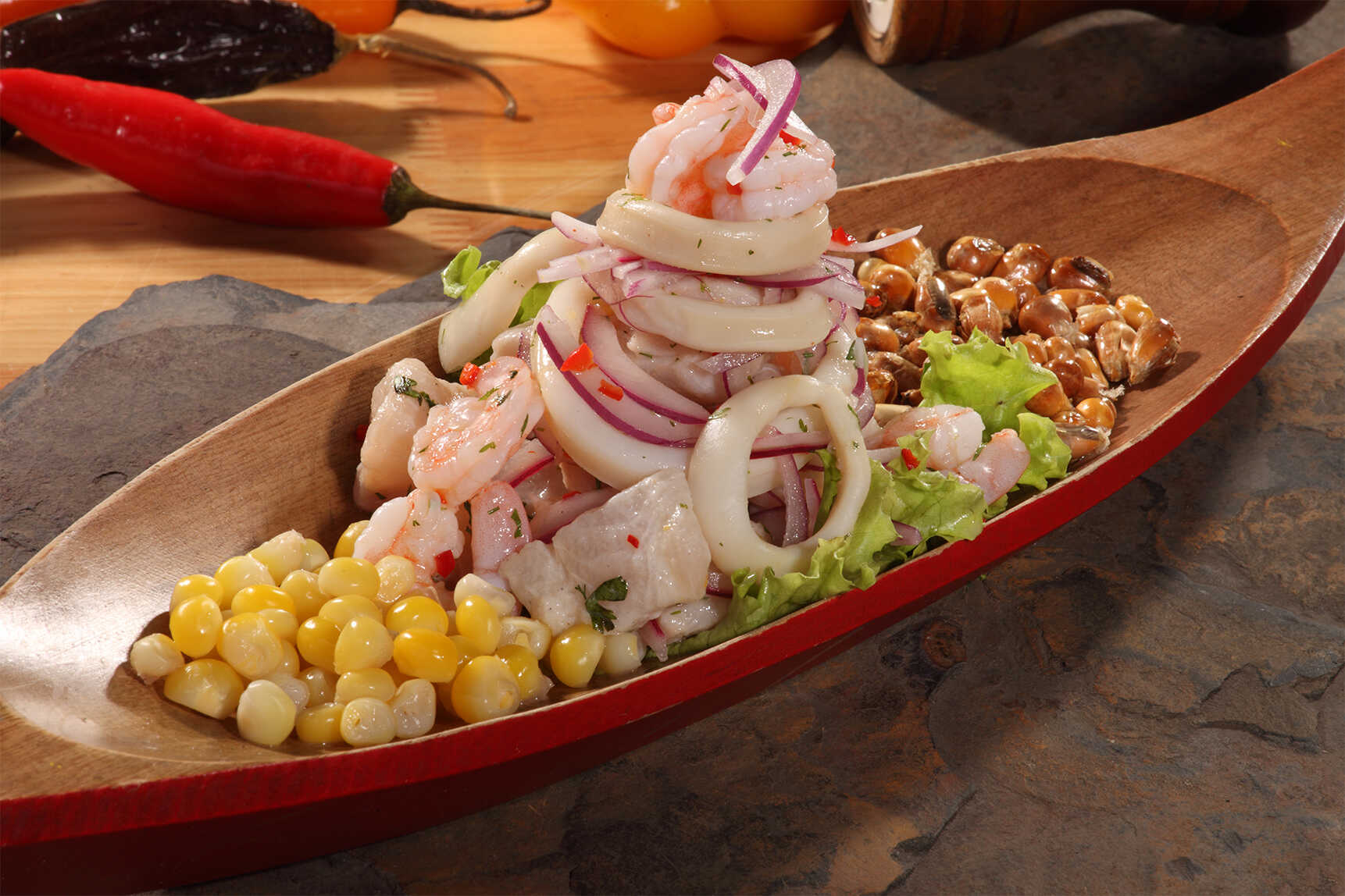 La mejor mezcla de pescado, camarón y calamar, bañado en leche de tigre. Acompañado de maíz chulpi y maíz dulce. Un afrodisíaco por naturaleza.