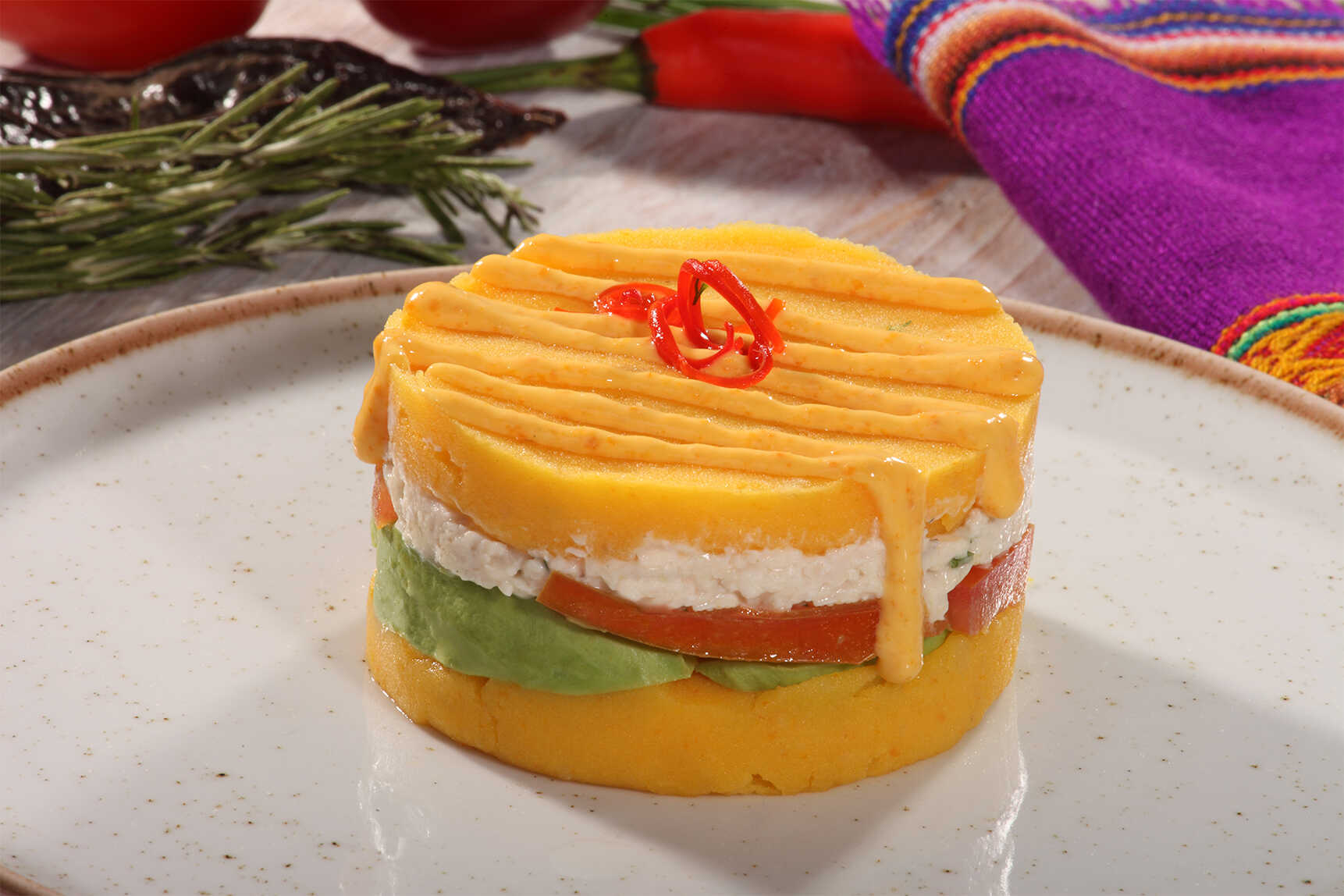 "Capas de puré de papa amarilla de tradicionales sabores peruanos con pollo. "