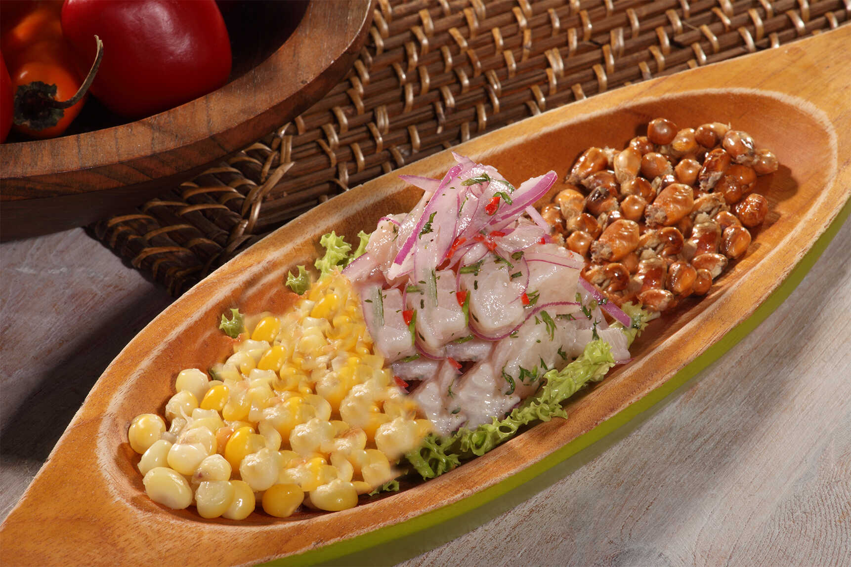 Plato insignia del Perú, no puedes irte sin probarlo. A base de pescado, ají limo, ají rocoto y leche de tigre. Acompañado de maíz dulce y maíz chulpi.