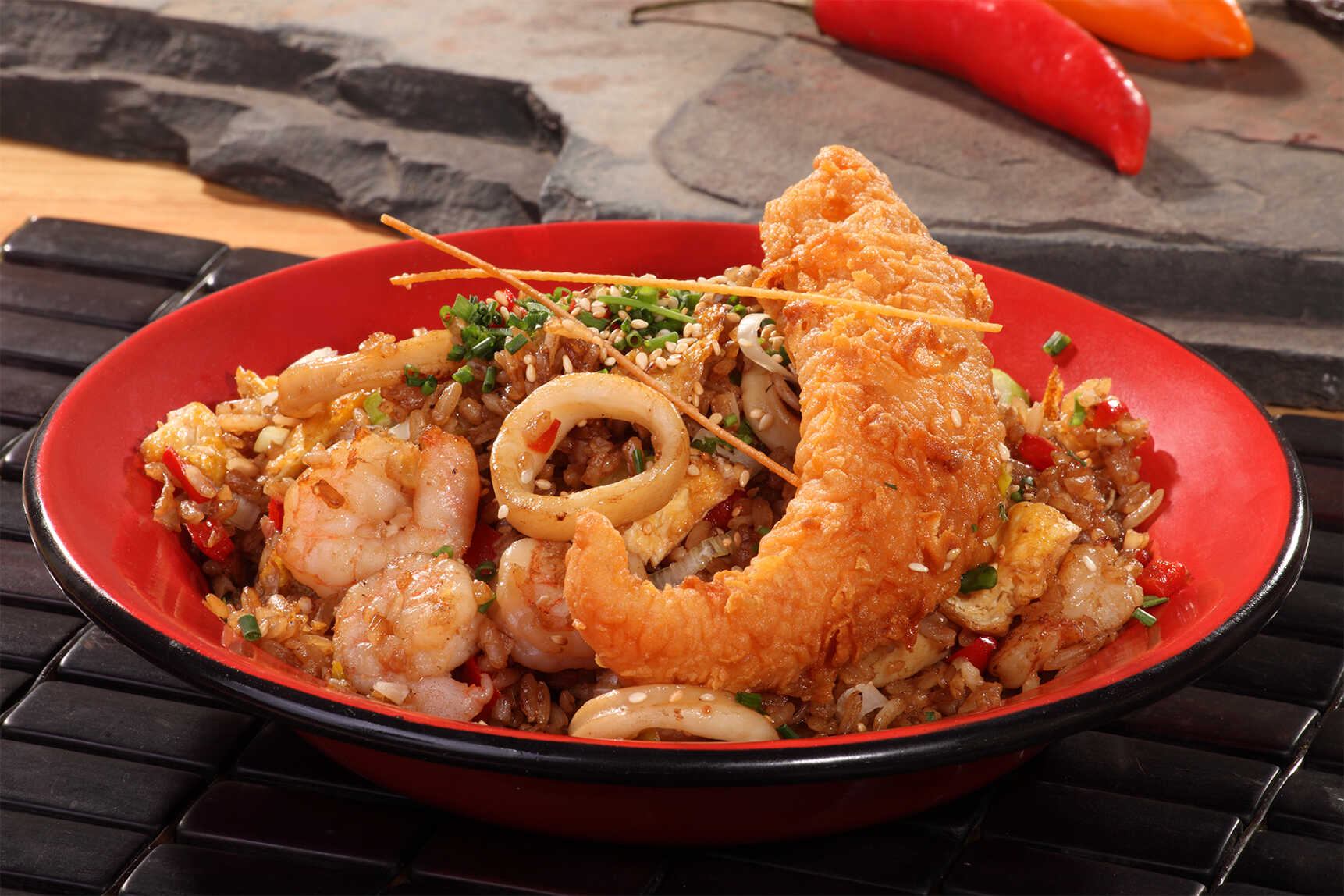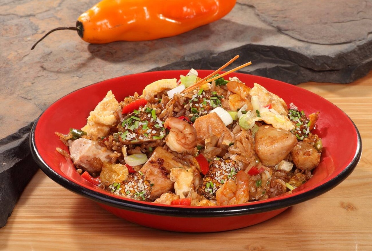 Traemos la mejor versión de nuestro chaufa y le agregamos un mix de mariscos y pescado apanado.