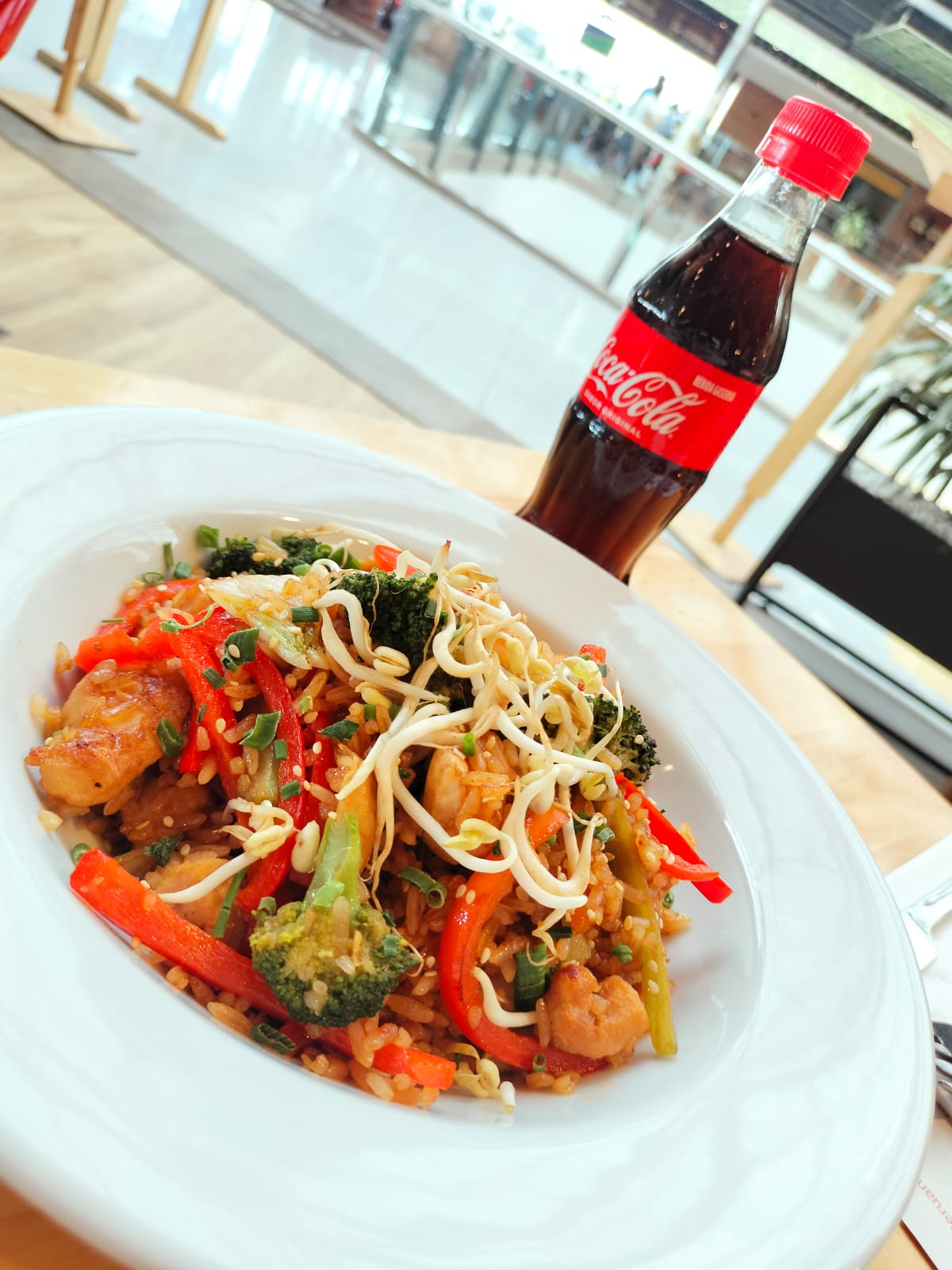 Arroz saltado al wok con pollo , vegetales y salsas legendarias chinas . El equilibrio perfecto del Yin y el Yan . Acompañado de Coca cola 400 ml.