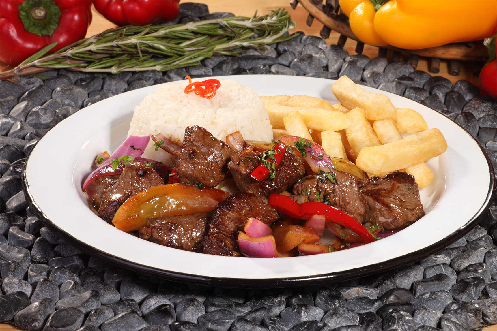 El orgullo del Peruano. Trozos de lomo fino de res, tomate, cebolla y pimentón, salteados al wok en salsa de vinagre y soya. Acompañado de papa a la francesa y arroz blanco.