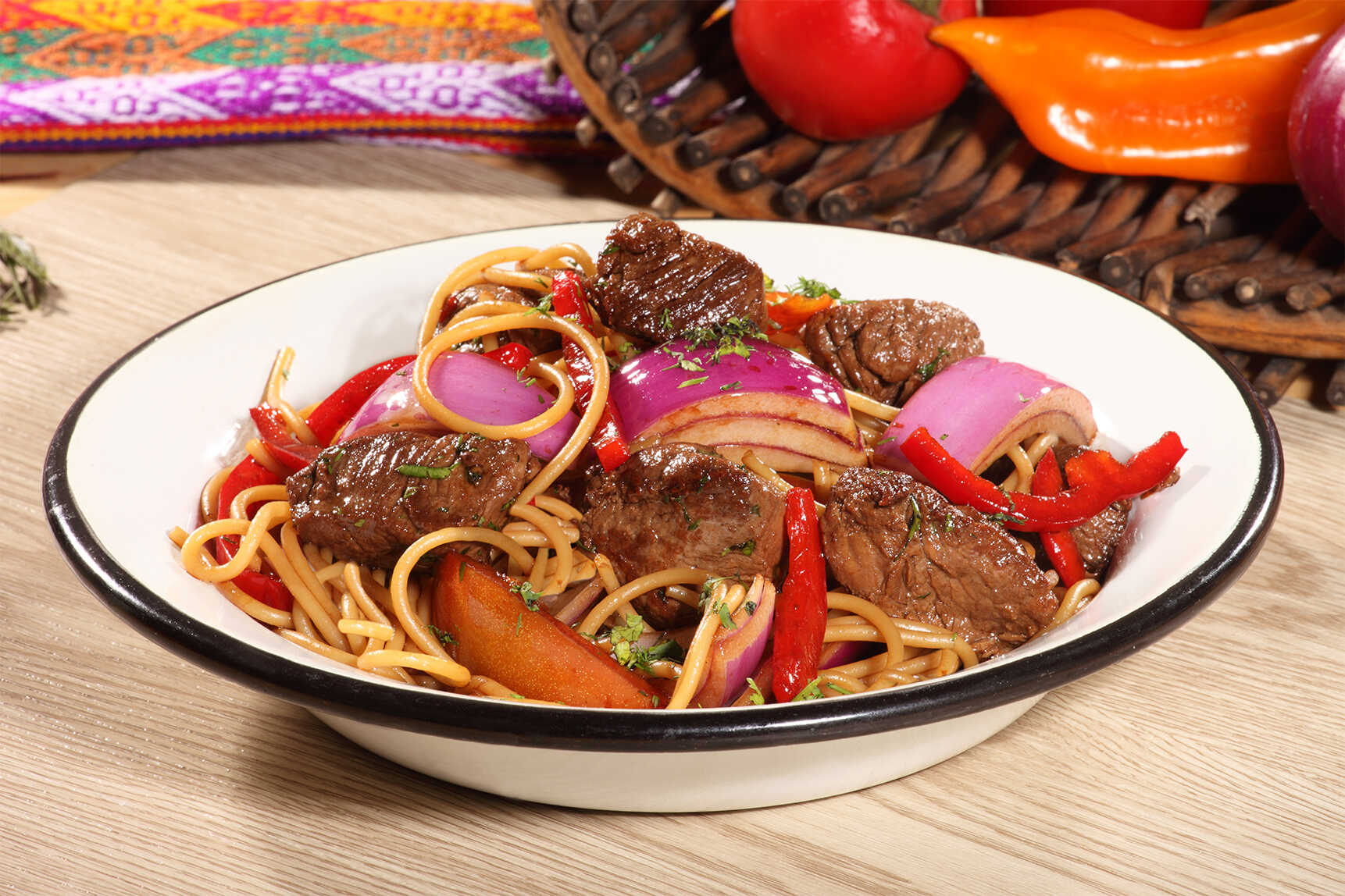 Tallarín al wok con cebolla, tomate, saborcito oriental, pimentón, lomo fino de res y todo el cariño de la casa.