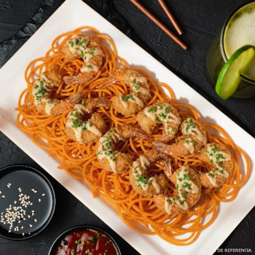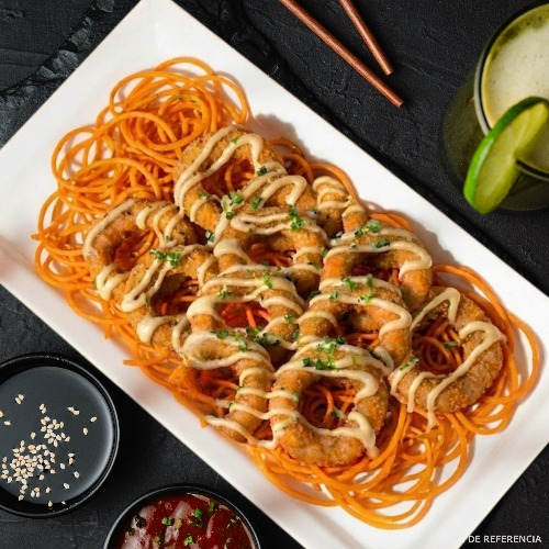 8 camarones crunch, salsa fantasy, cebollín y una cama de zanahoria en espiral.