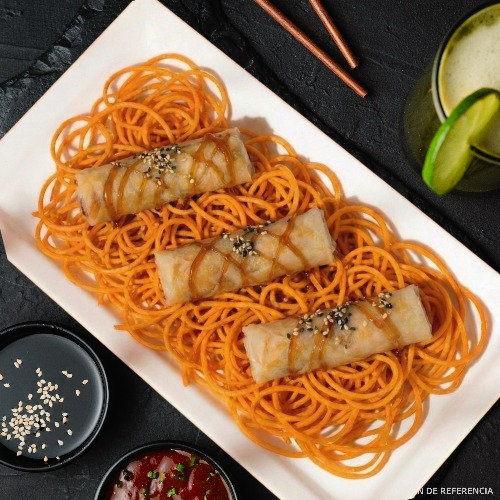 3 spring roll, salsa teriyaki, ajonjolí mixto y una cama de zanahoria en espiral.