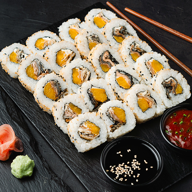 Paga 12 bocados de sushi y lleva 24 bocados frescos o tempura de kaory Roll (Camarones tempura, queso crema, aguacate, cubierto de ajonjolí con topping de pasta de palmito, cabello de ángel crocante, mix de salsas y cebollín).