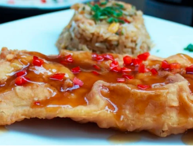 Pescado en salsa de tamarindo, acompañado de arroz chaufa y yuquitas.
